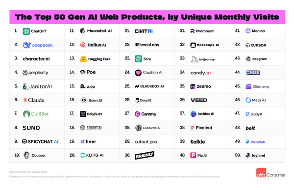 跃居全球AI产物排行榜第二位,除了DeepSeek,AI文生视频范畴,海螺视频排名第12,正在挪动端,百度AI搜刮排名第4,月之暗面排名第11,据领会,豆包排名第10,DeepSeek排名第14,美图排名第17。不外随后因正在部门国度被禁,
